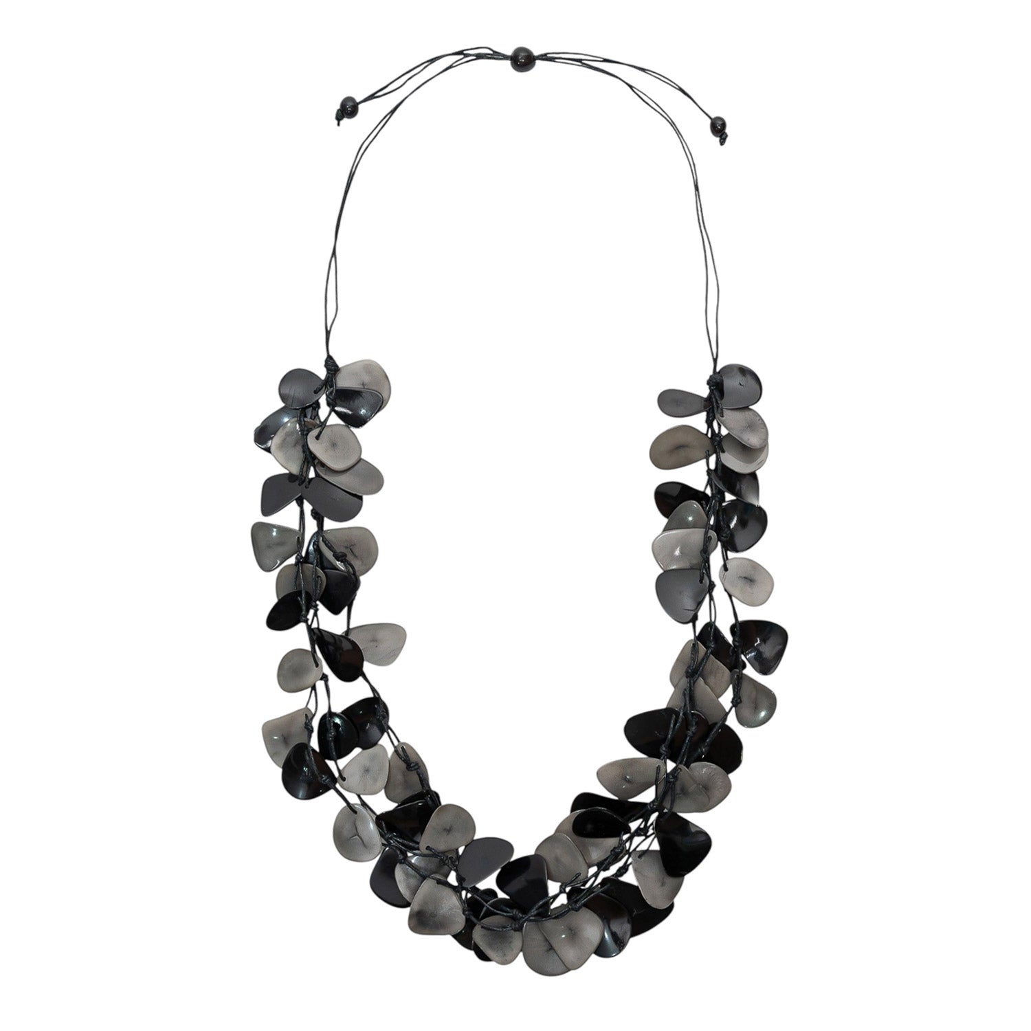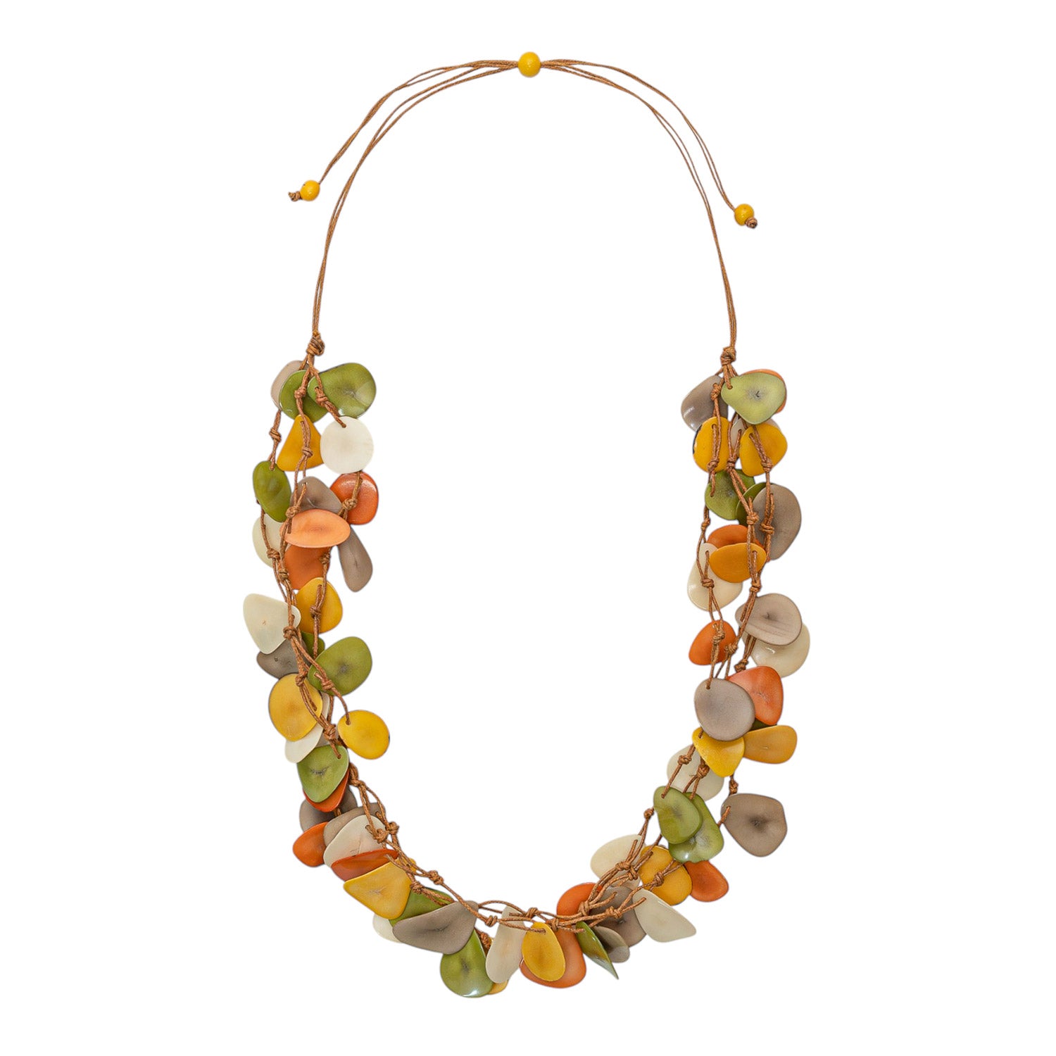 The Rosemary Necklace features an adjustable wax cotton cord ranging from 22" to 38", allowing for versatile wear. It showcases multiple layers of hand-carved, smooth tagua slices, each meticulously crafted to highlight the natural beauty of this sustainable material. This necklace combines artisanal skill with eco-conscious design, making it a striking accessory that adapts to your style while supporting ethical craftsmanship.