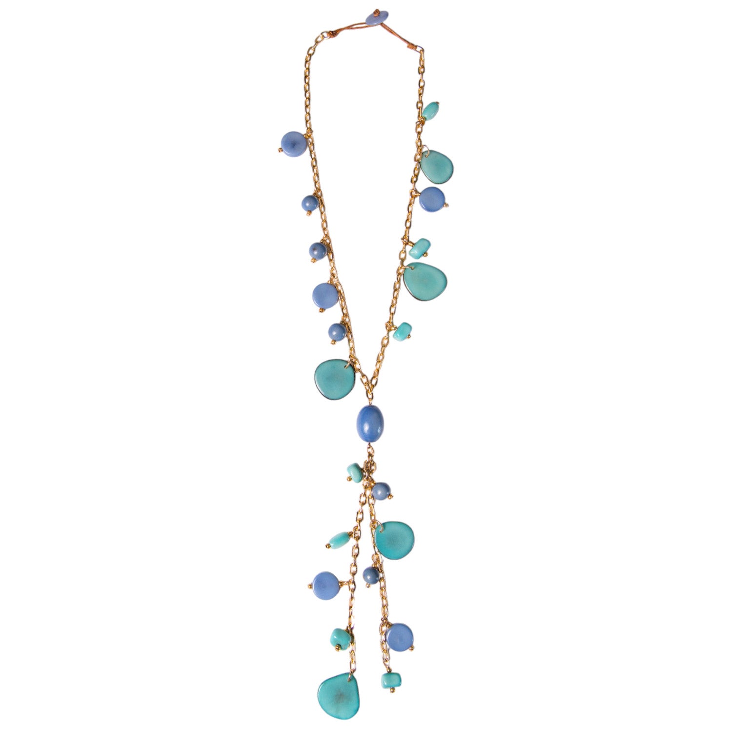 Add a splash of joy to your style with the Josie Necklace. This playful Y-drop design is a delightful mix of colorful tagua slices, acai berries, and a single bombona seed that splits the necklace, creating a fun, eye-catching layer. The gold-finished brass chain adds a touch of sophistication, making it perfect for dressing up or keeping it casual.